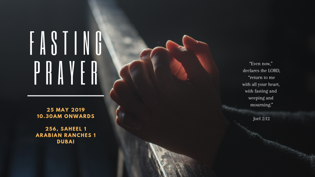Come & be blessed with your friends and family as our fifth fasting prayer commences  @ 10:30 am onwards on 25th May 2019 @Arabian Ranches . Expect the manifestation of the Holy Spirit delivering us from bondage , healing us and reviving us in Jesus Name. Don’t Miss it!!